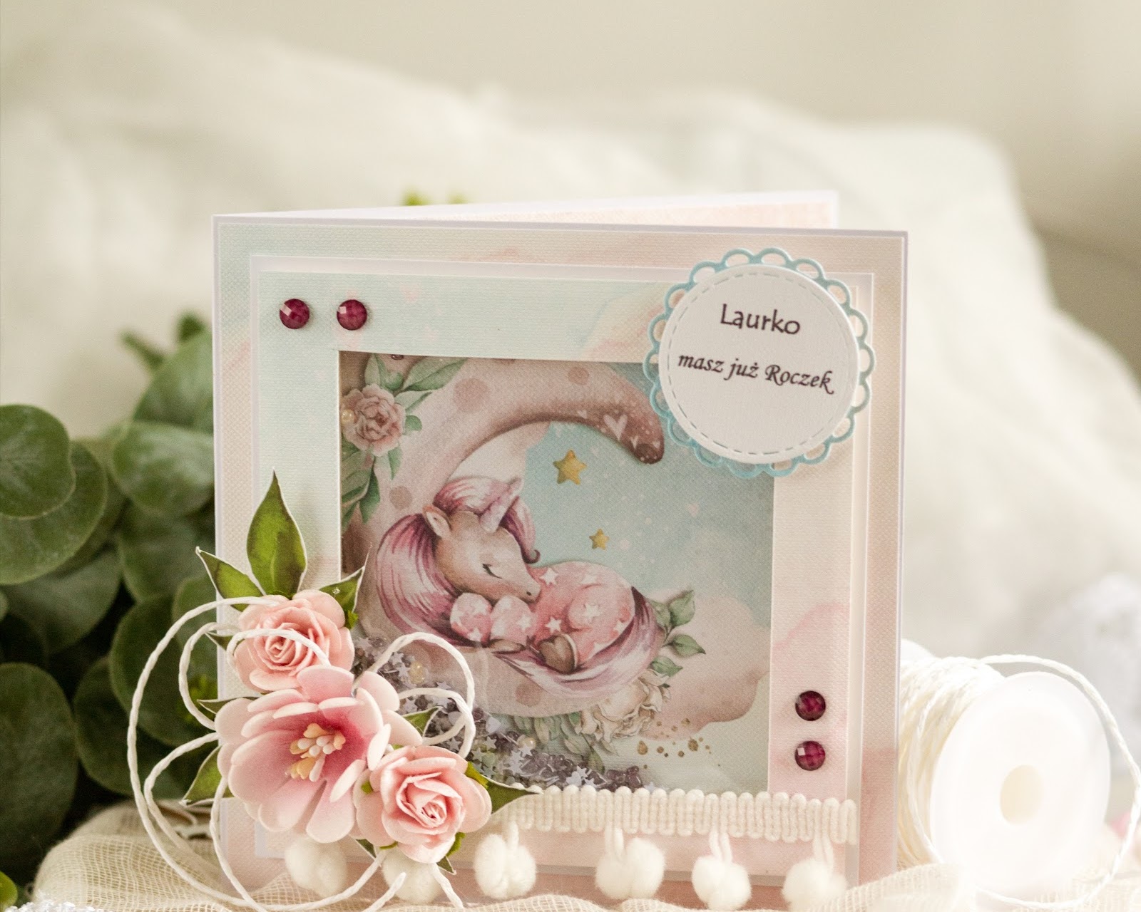 Witajcie Kochani! Jutro moja Córcia kończy roczek! Chyba nie będę oryginalna, pisząc, że nie wiem, kiedy to przeleciało :) Temperamentem wydała się za mamą, bo nie usiedzi w miejscu, a największą atrakcją jest buszowanie w scraproomie i wyciąganie wszystkich papierów z półek :) Z okazji urodzinek przygotowałam kar…